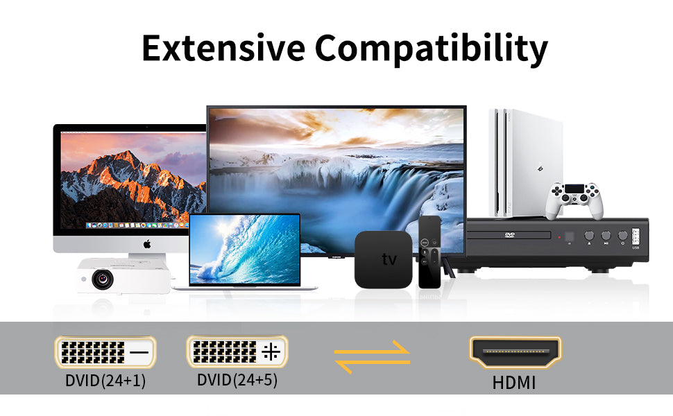 Support devices with HDMI port such as Laptop, Desktop, PS3, PS4, TV Box, Blu-ray, Xbox 360, Xbox One, Roku, Apple TV, Play Station 3/4; Support devices with DVI port such as Display, Monitor, Projector etc.