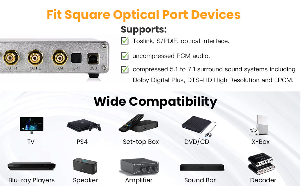 This fiber audio cable is perfect for Home Theater, Sound Bar, TV, PS4, Xbox, VD/CD player, Blu-ray players, Game console.