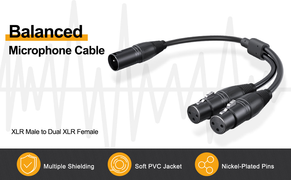 • XLR Male to Dual XLR Female Y-Splitter 3Pin Balanced Microphone Cable Professional series XLR plugs, designed for equipments with 3-pin XLR connectors such as shotgun microphones, studio harmonizers, mixing boards, patch bays, preamps, speaker systems, and stage lighting.